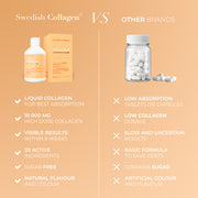 Rozpocznij swój dzień od świetlistego zastrzyku energii Swedish Collagen Poranny blask, potężna mieszanka 10 000 mg hydrolizowanego kolagenu morskiego I biotyna który wspiera skóra, włosy, I paznokcie. Ulepszone o Witamina C, A, witaminy z grupy B, selen, I krzemionkaTa zaawansowana formuła pielęgnuje Twoje piękno od wewnątrz. Dzięki dodatkowym korzyściom kwas hialuronowy, MSM, DMAE, I probiotyki w mikrokapsułkach, wspomaga również nawodnienie, odnowę komórkową i równowagę jelitową. 25 ml dziennie pomaga Ci naturalnie promienieć — od wewnątrz i na zewnątrz.